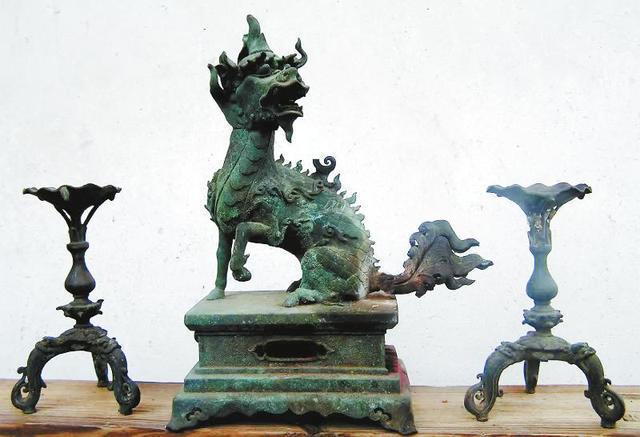连城县四堡镇雾阁村,八旬老先生邹恒彦家珍藏一尊重达8斤的铜制甪端麒麟。